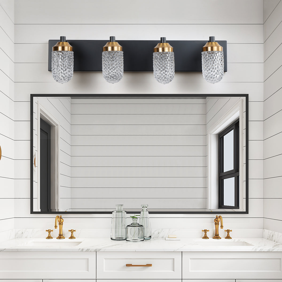 Elevate your bathroom with the Orelli Lightings 4-Light LED Vanity Light. This modern fixture features four clear glass lampshades paired with a sleek, matte black frame, blending contemporary style with timeless elegance. Measuring 24.8" L x 6.3" W x 6.5" H and weighing 8.44 lbs, it’s designed for easy installation above bathroom mirrors or vanities, creating a bright, inviting ambiance.
