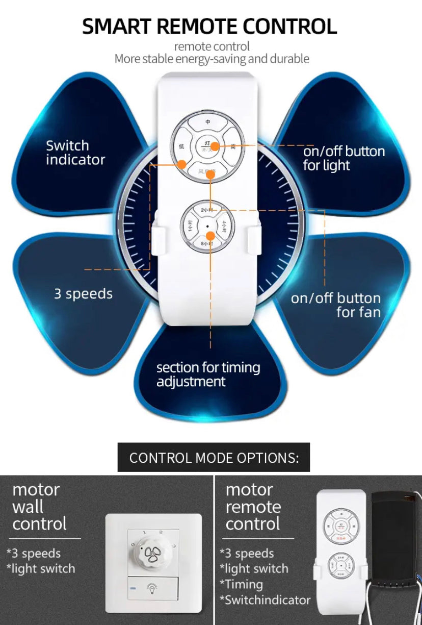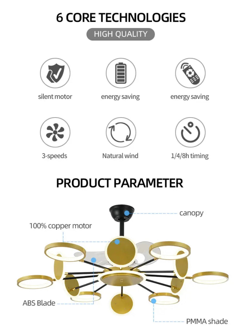 Upgrade your living space with our Modern Ventilation Fans. This industry-specific fan features a copper+metal+PMMA+ABS blade design for a sleek and modern look. With a remote control for easy operation, this fan also includes LED lighting for energy-efficient solutions. Get a 10-year motor warranty for reliable performance and 6-speed control for customizable comfort. Perfect for any home, hotel, or restaurant.