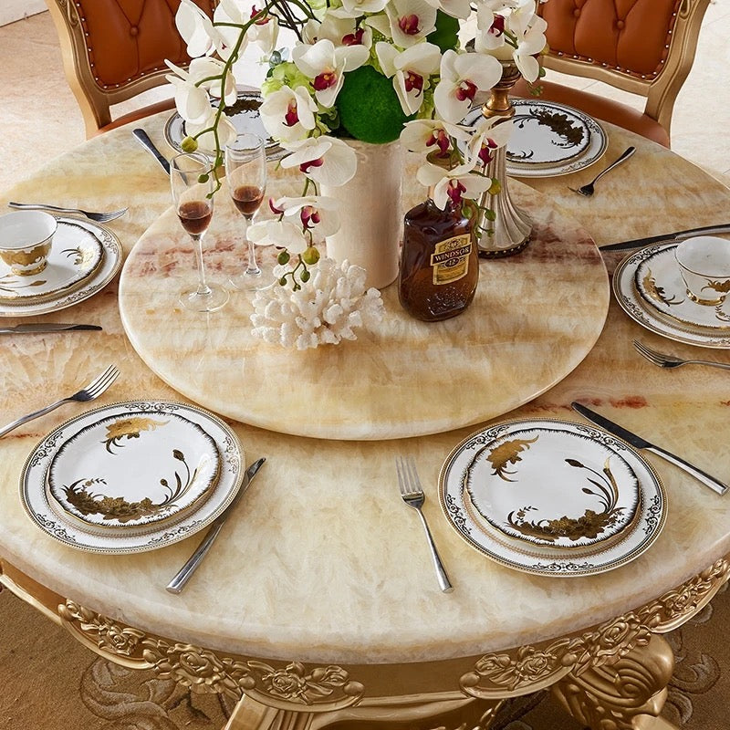 Barock Style Dining Table Set Golden Foil Hand Carved Italian Design Dining Room Furniture