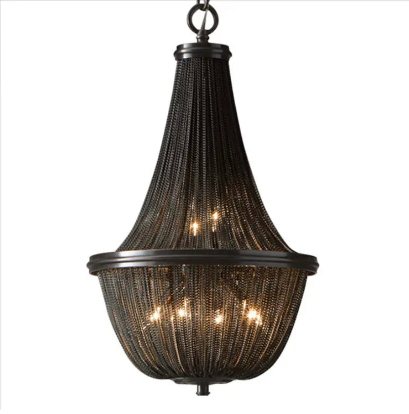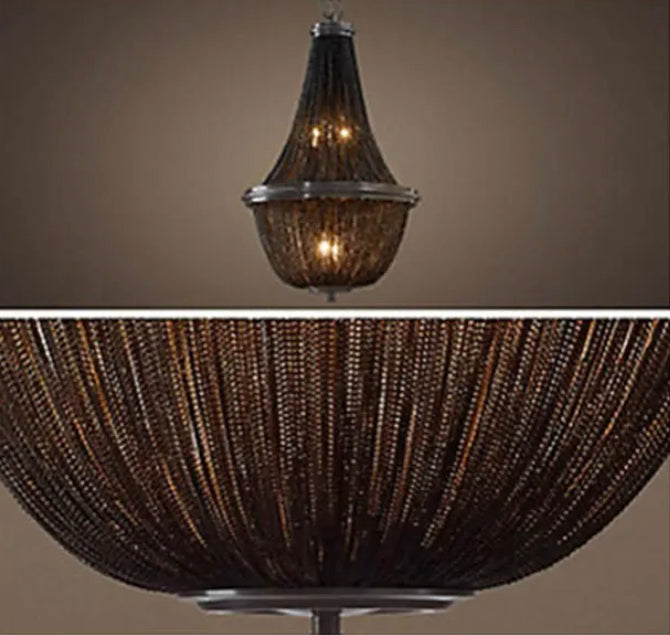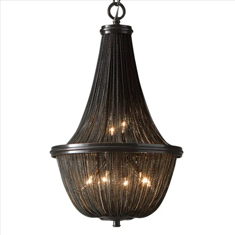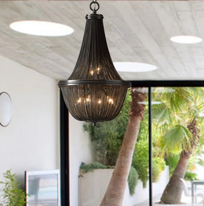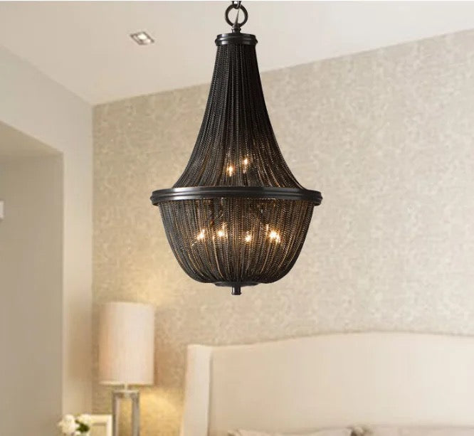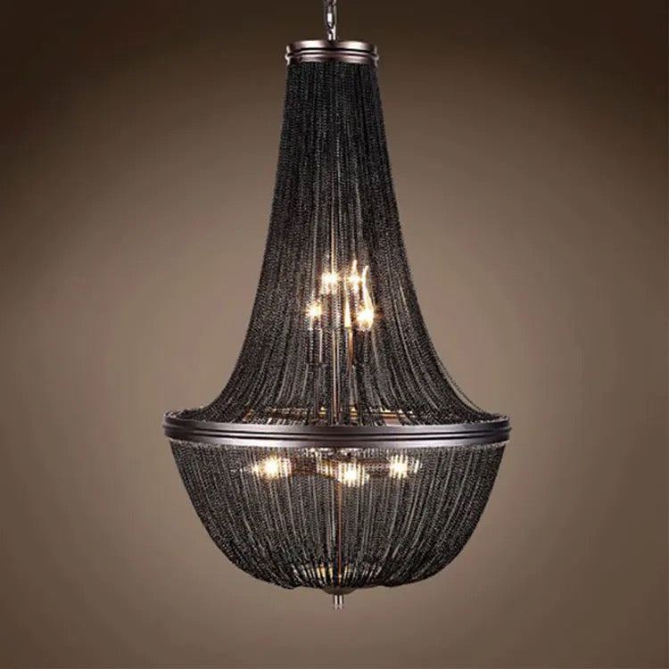 The Postmodern Chandelier boasts a modern design with sleek black aluminum chain and fringed tassels. Crafted with high-quality materials, including a 5-year warranty, this chandelier is perfect for adding elegance and lighting solutions to your living room or staircase. With a lifespan of 30,000 hours and remote control, it promises energy savings and customizable lighting.